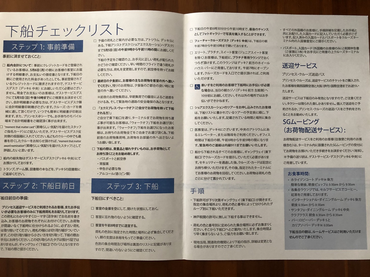 これまでのクルーズでは荷物を出してください~という案内が多かったのですが、今回は予め下船方法が「Walk Off(荷物ごと自分で下船)」になっていました。